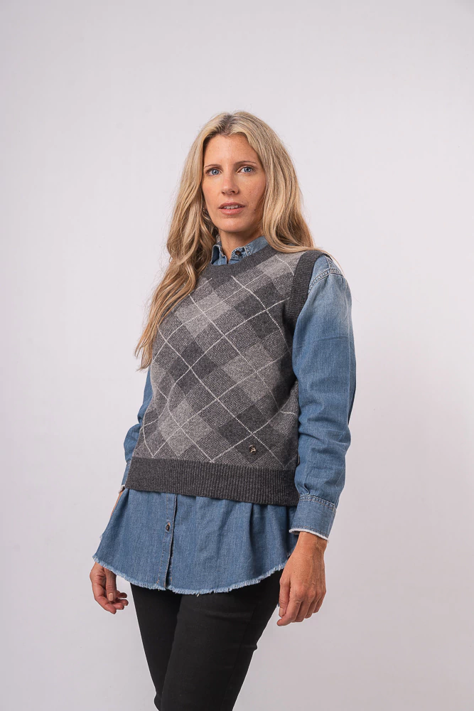 Chaleco escote redondo tejido en jaquard con motivo de rombos. De corte recto y ancho, es una prenda ideal para estar cómoda y abrigada sin dejar de lado el estilo.