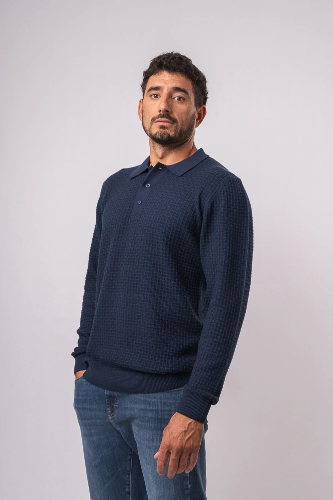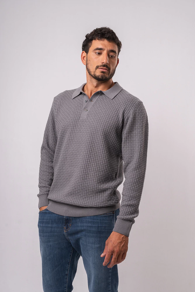 Sweater cuello polo fino con cartera y botones, tejido con punto canasta en toda la prenda, dándole una textura única. Tejido con woolcot italiano, es un sweater liviano y abrigado al mismo tiempo. Regular fit, manga copa.