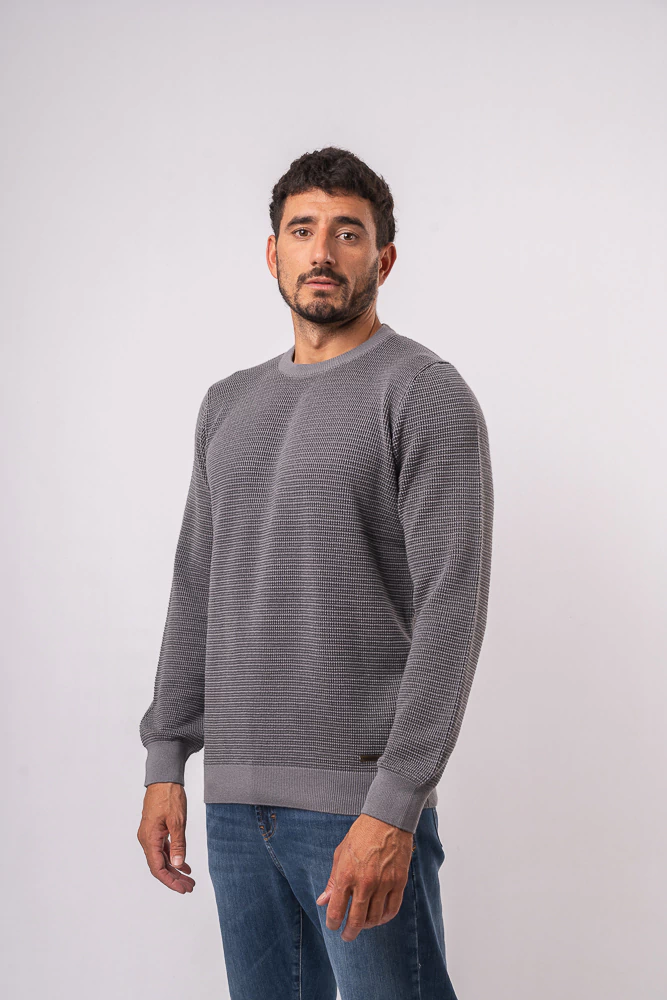 Sweater cuello redondo fino, tejido con punto fantasía tramado a dos colores, que le da un leve efecto tornasolado. Tejido con woolcot italiano, es un sweater liviano y abrigado al mismo tiempo. Regular fit, manga copa.